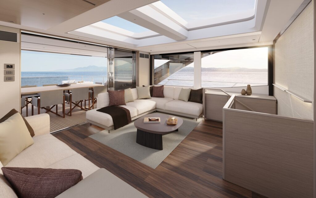 Another first for Princess is the beautiful curved patio doors that connect this area with the main deck saloon. When open, these effectively place the 10-place dining table that is situated aft of the saloon, in the cockpit providing incredible flexibility. Even when closed the curvature of the glass accentuates the connection to the outside such is the view that they provide.