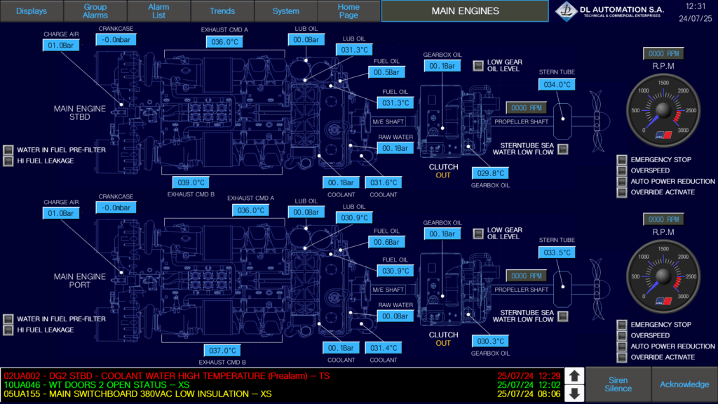 Additionally, we integrated key indicators from the MTU Main Engines – such as pressures and revolutions per minute – into our own graphical environment. What truly distinguishes this solution is the seamless integration of all critical systems into the DS-06 AMS.