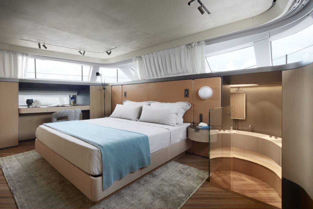 The exterior lines, designed by Zuccon International Project, structure the yacht over two and a half decks, featuring an open flybridge, a lower deck, and a main deck. The layout is designed to guarantee the boat’s maximum liveability, introducing new solutions that give a totally new perception of space compared to other yachts in the same range. This remarkable flexibility allows the yacht to adapt to the evolving needs of life on board, transforming through innovative furnishing solutions and versatile configurations. This approach is matched by meticulous material research: the saloon’s bow wall, for example, is crafted in bronzed fluted glass, creating a refined effect that enhances its sense of depth.