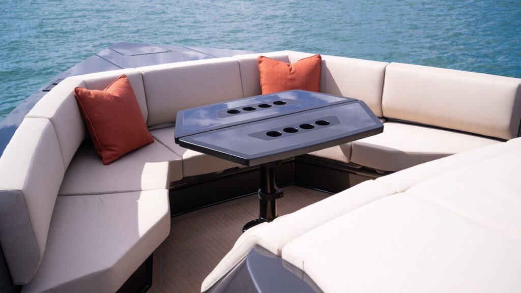 When you want to catch a little more breeze, turn to the sophisticated foredeck lounge which rounds out the exterior entertaining spaces of the boat. Here, a triple sun bed is laid out on the coachroof with clear sightlines out over the bulwarks. Deep, upholstered seating fills the V-shape of the bow around a table that makes the perfect spot for a morning coffee or a sundowner among friends. An awning can easily be rigged here to provide shade.