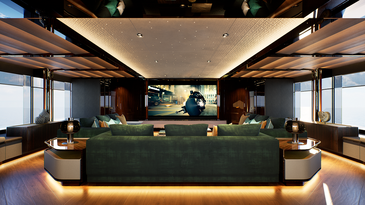 It’s both opulent and reserved, inviting and stately, with a refined tone that seamlessly integrates across four decks. Using myriad materials, surfaces and hues to strike a unique balance between texture and detail, the show-stopping design is a treat for the senses, from the polished Italian marble flooring in the main salon to the sumptuous leather ceiling that cocoons the upper deck family cinema.