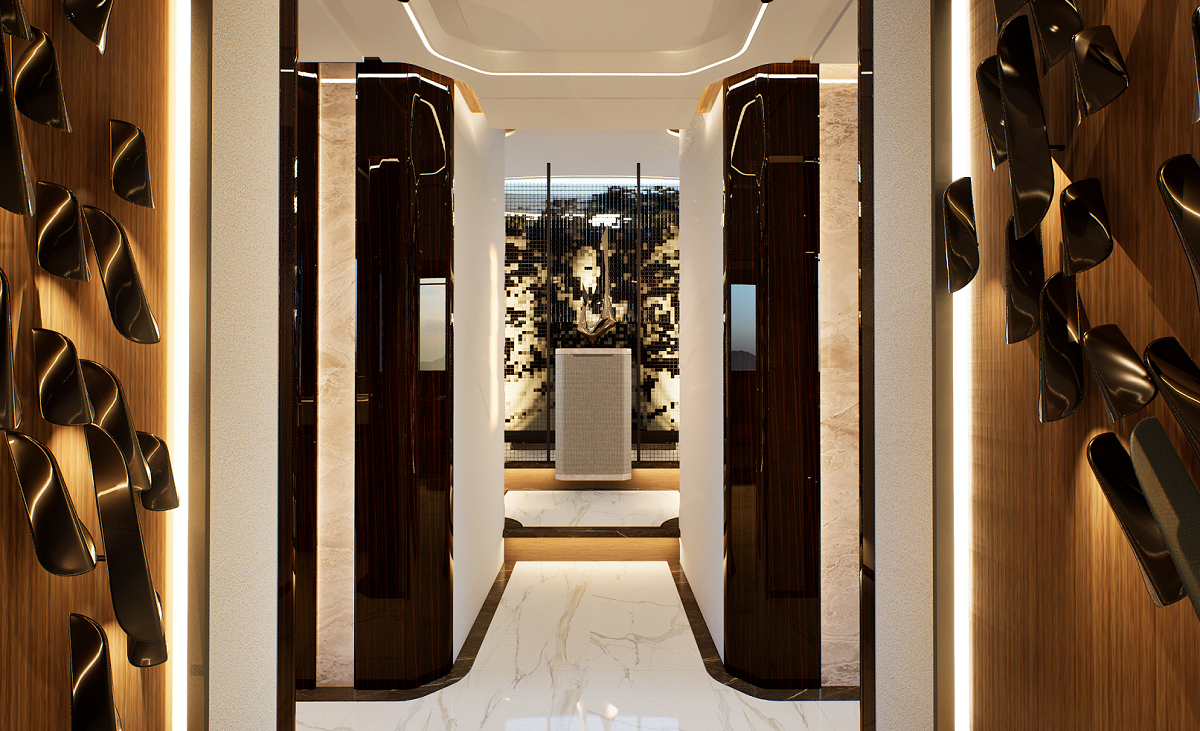 The guest hallway leading to the owner’s suite is a true mille-feuille of craftsmanship: layers of leather, glossy rosewood, marble inlay and custom lighting converge with dramatic effect. In the multifunctional sky lounge cinema, subtle Middle Eastern motifs echo gently across the embossed leather ceiling. Slanted ceiling panels direct soft lighting onto bottle green velvet sofas, while an undulating sustainably-sourced teak floor brings barefoot luxury. Even the cabinet handles carry their own artistry, inlaid with precious stone, marble and leather.