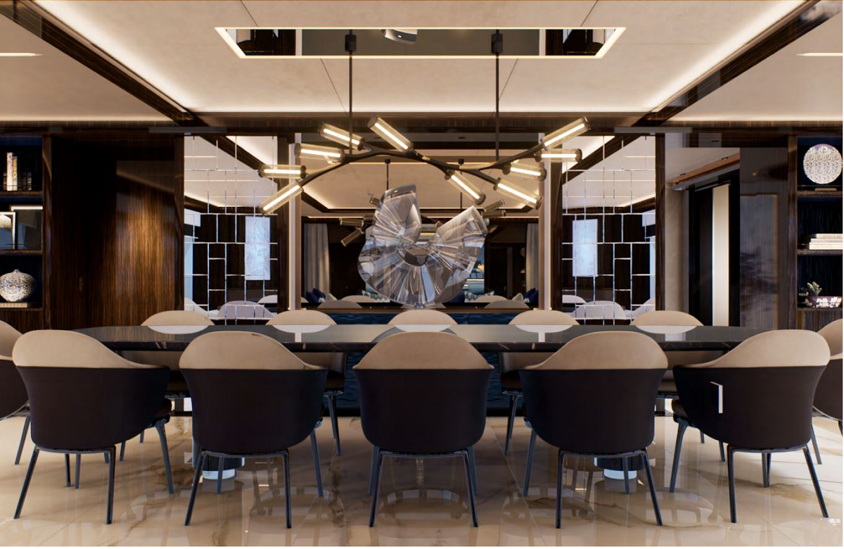 Completing the composition is Vripack’s signature transitional lighting scheme. By day, natural light cascades through the yacht’s full-height windows. By evening, the atmosphere softens with a bespoke chandelier above the dining table and a twinkling LED ceiling in the sky lounge.