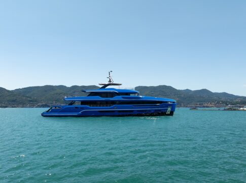 Sergio Cutolo, President and Founder of Hydro Tec, comments: „The wider 7.7-meter beam provides excellent hull volume and greater fuel storage, extending the range to over 4,000 nautical miles cruising at 10 knots. Our CFD analysis showed minimal efficiency loss with the wider beam, while the extra fuel capacity is advantageous for long-range cruising and refuelling at more economical locations, making it perfect for Mediterranean routes where fuel prices can vary significantly from country to country.”