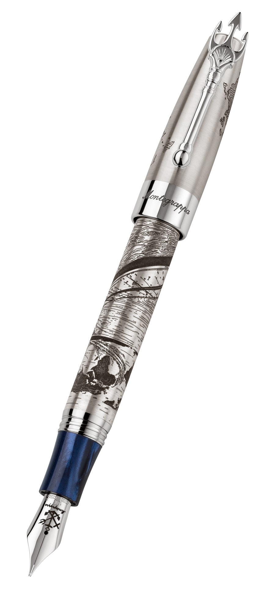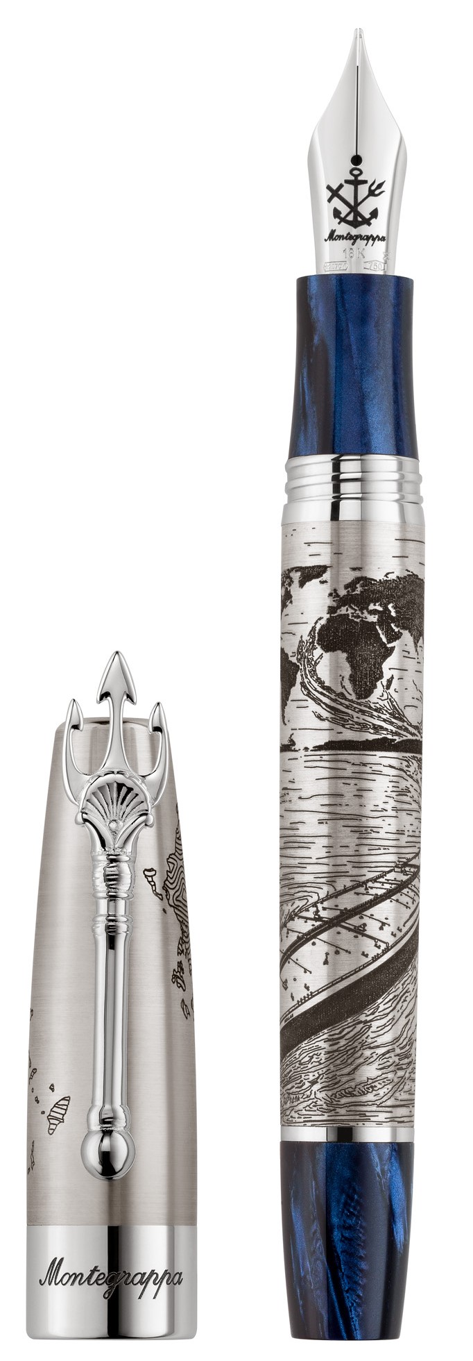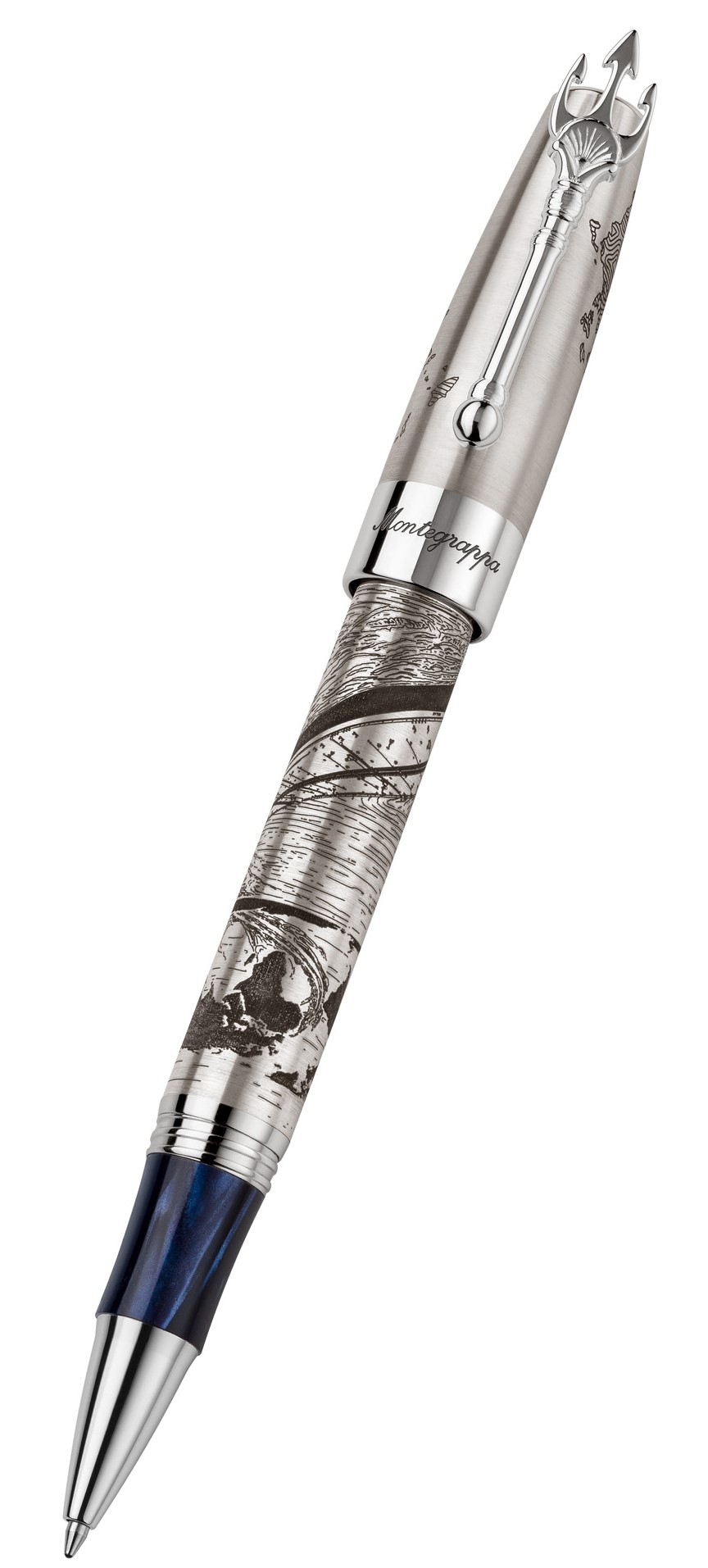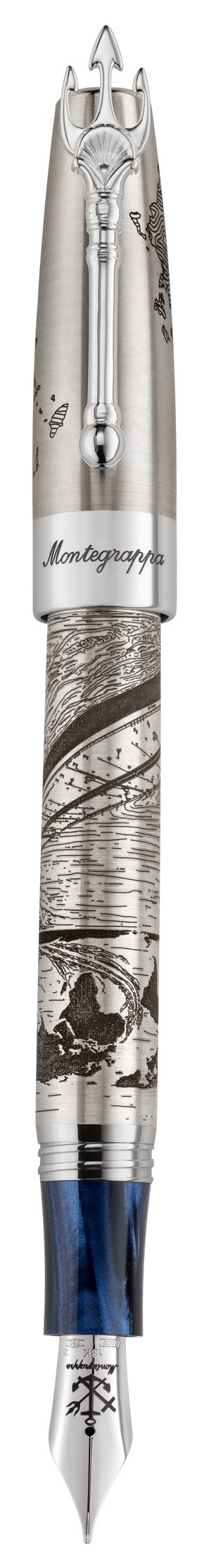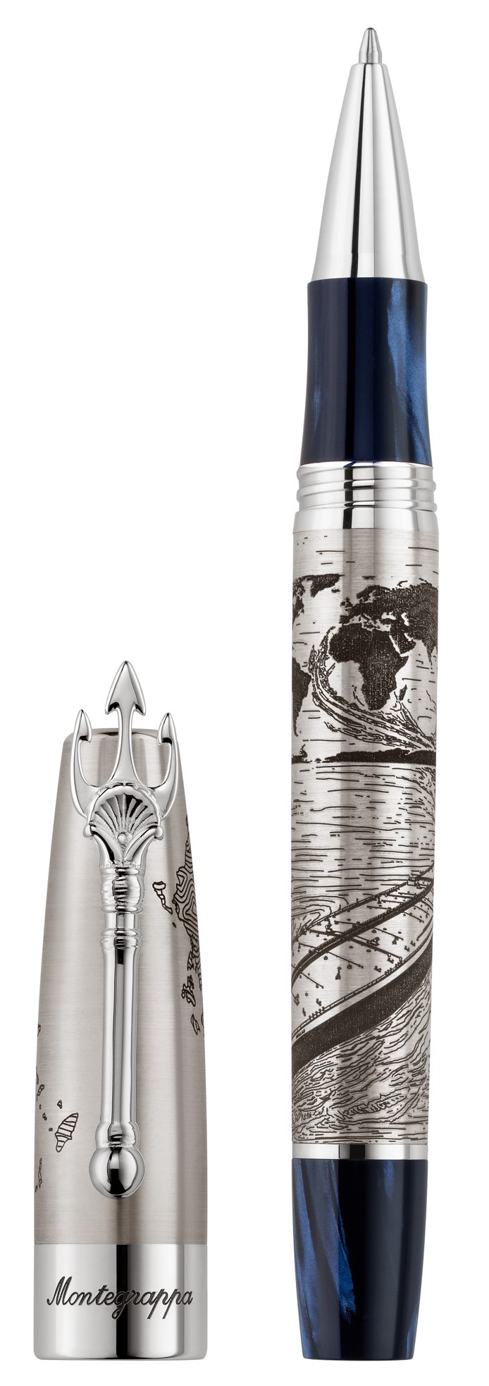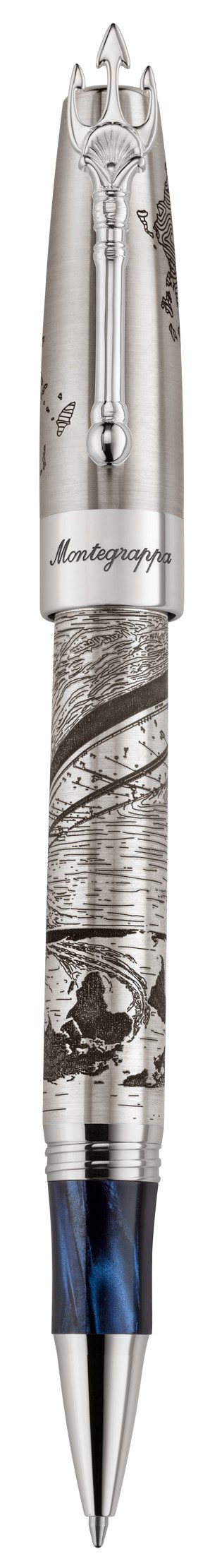 With design references to the legacy of Greek shipping, the pen bears the Greek map engraved on the lid, while the body depicts a ship embarking on a transatlantic journey. A central element that stands out is the trident-shaped clip, a clear reference to the symbol of Poseidon, the Olympian god of the sea.